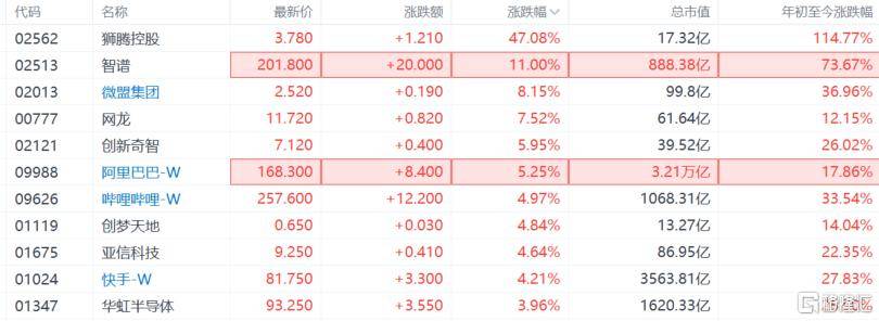 狮腾控股飙升超47%、智谱涨近11%、微盟集团涨超8%、网龙涨超7%、阿里巴巴涨超5%、哔哩哔哩等涨超4%。