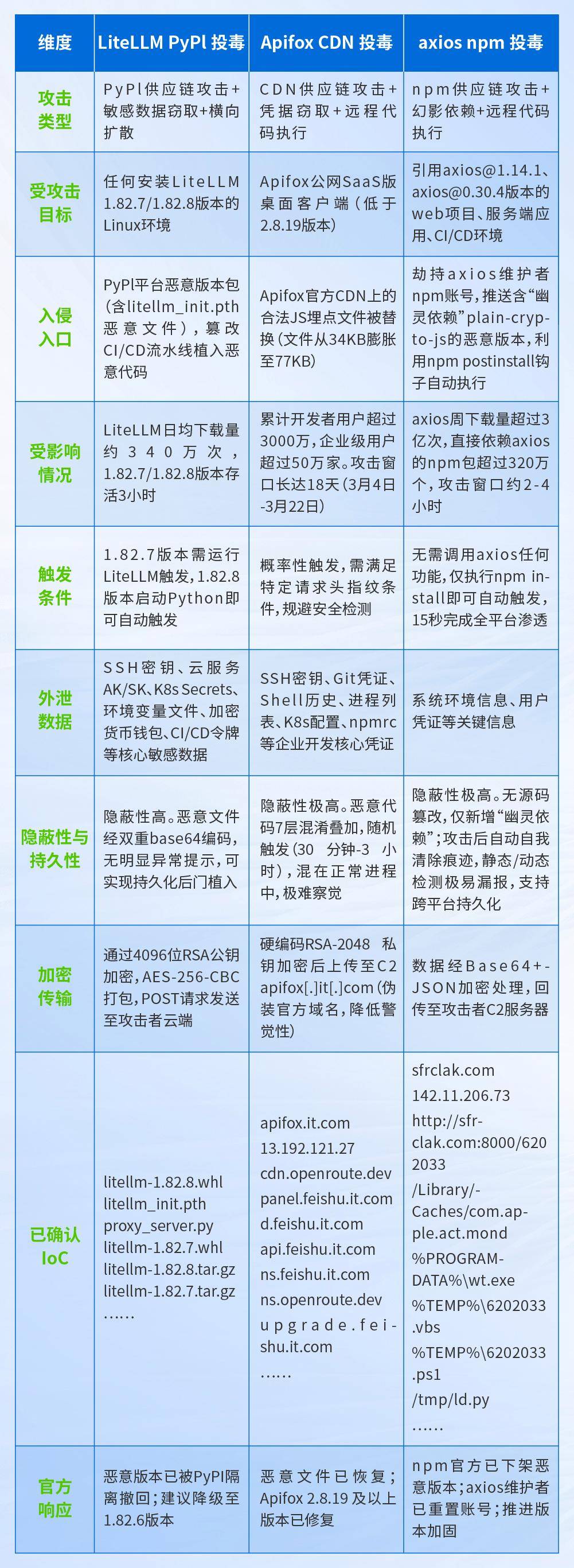 从LiteLLM、Apifox到axios接连爆发的供应链投毒事件中,我们可以看出:供应链攻击已进入常态化、精准化的新阶段,安全风险全面升级。