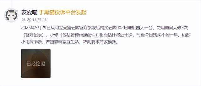 为了追赶进度,云鲸加快了新品推出节奏,却也付出了品质下滑的代价。截止2026年4月14日,在黑猫投诉平台上,关于云鲸的投诉量已超3901条。有消费者反映,2025年5月29日,她从天猫云鲸官方旗舰店购入云鲸002扫地机器人,使用不到一年,官方记录大修3次,小修及配件更换近十次,至今故障频发,严重影响生活。