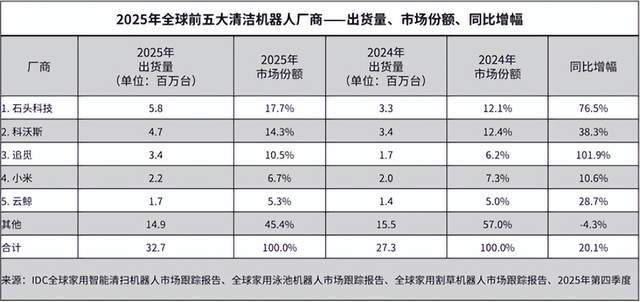 数据不会说谎。根据IDC 2025年发布的报告,云鲸全球市场份额仅为5.3%,位列行业第五,与头部玩家差距悬殊。石头科技以17.7%的份额领跑全球,科沃斯紧随其后,占比14.3%。在国内市场,云鲸更是被科沃斯、石头、追觅等巨头前后夹击,想要突围难如登天。