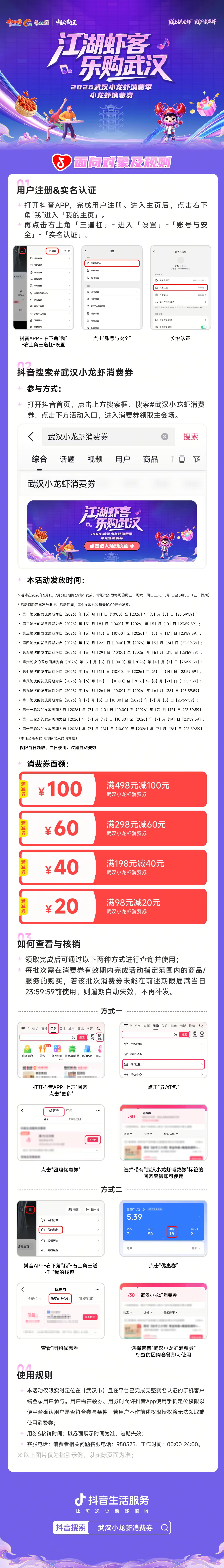 据介绍,本次消费券仅限在2026武汉小龙虾消费券活动商家使用,不可跨市州使用;用券及核销时间以券面展示时间为准,逾期失效。