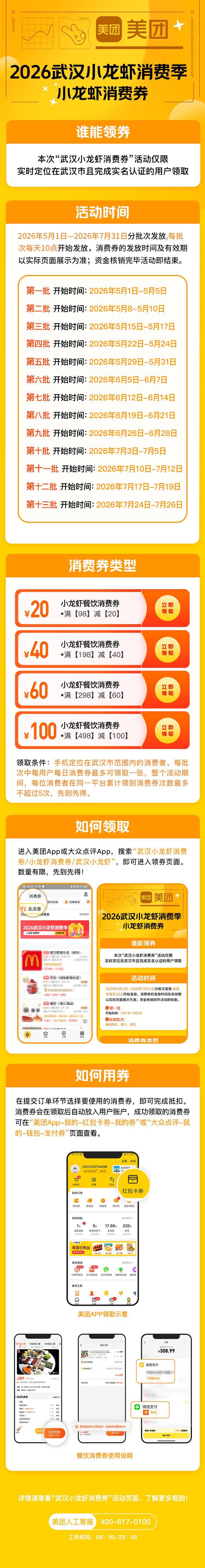 2026武汉小龙虾消费券实行分批次发放与核销。常规批次为每周的周五、周六、周日三天,并设置5月1日至5月5日(五一假期)为活动首轮专属发券批次。小龙虾消费券在每个发券批次每天10:00开始在平台上发放,先到先得,当日券额领完即止。消费券核销有效期截止当天24时。活动期间根据实际核销情况,动态优化调整发放安排,具体发券批次以通知为准。