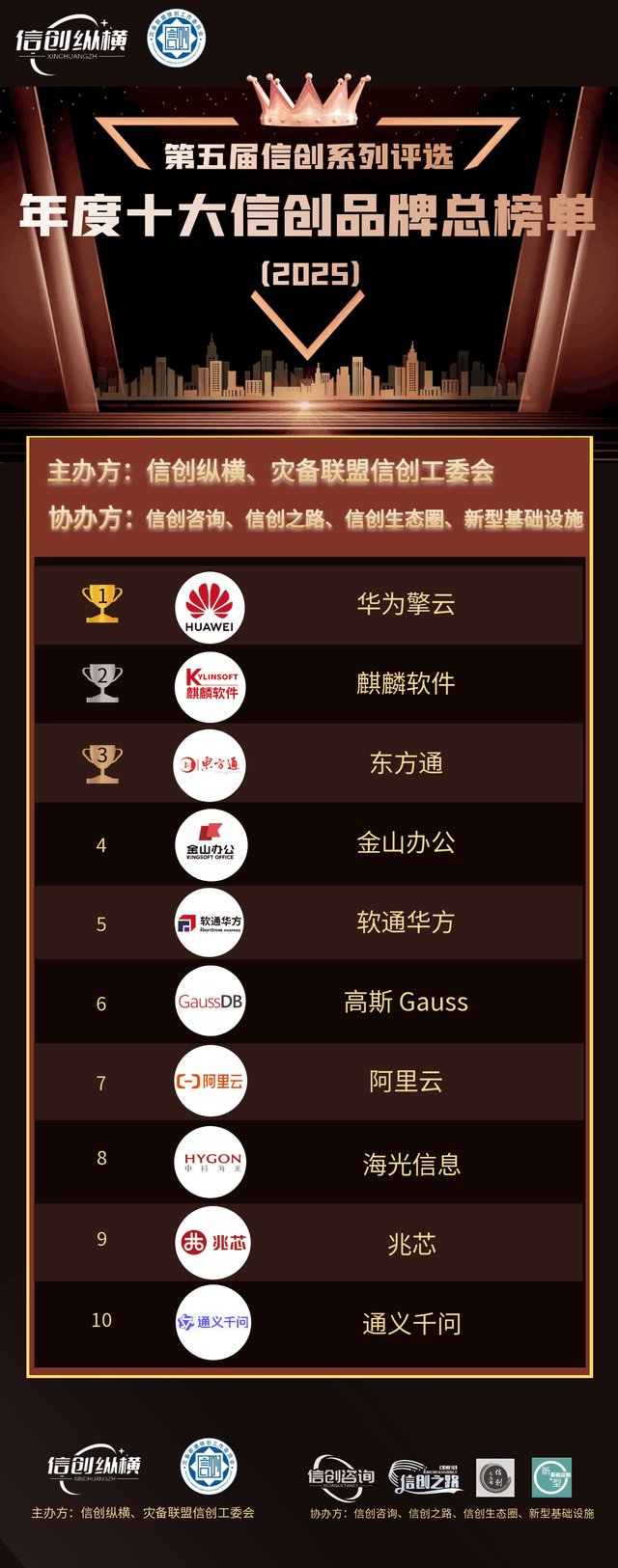 经过10多天竞争激烈的投票阶段,第五届信创系列评选之“年度十大信创品牌”总榜单出炉了!此次评选,以面向社会公众的投票数叠加面向信创纵横认证会员的投票数,总计票数从高到底顺序排出年度十大信创品牌总榜单。最终名单如下:
