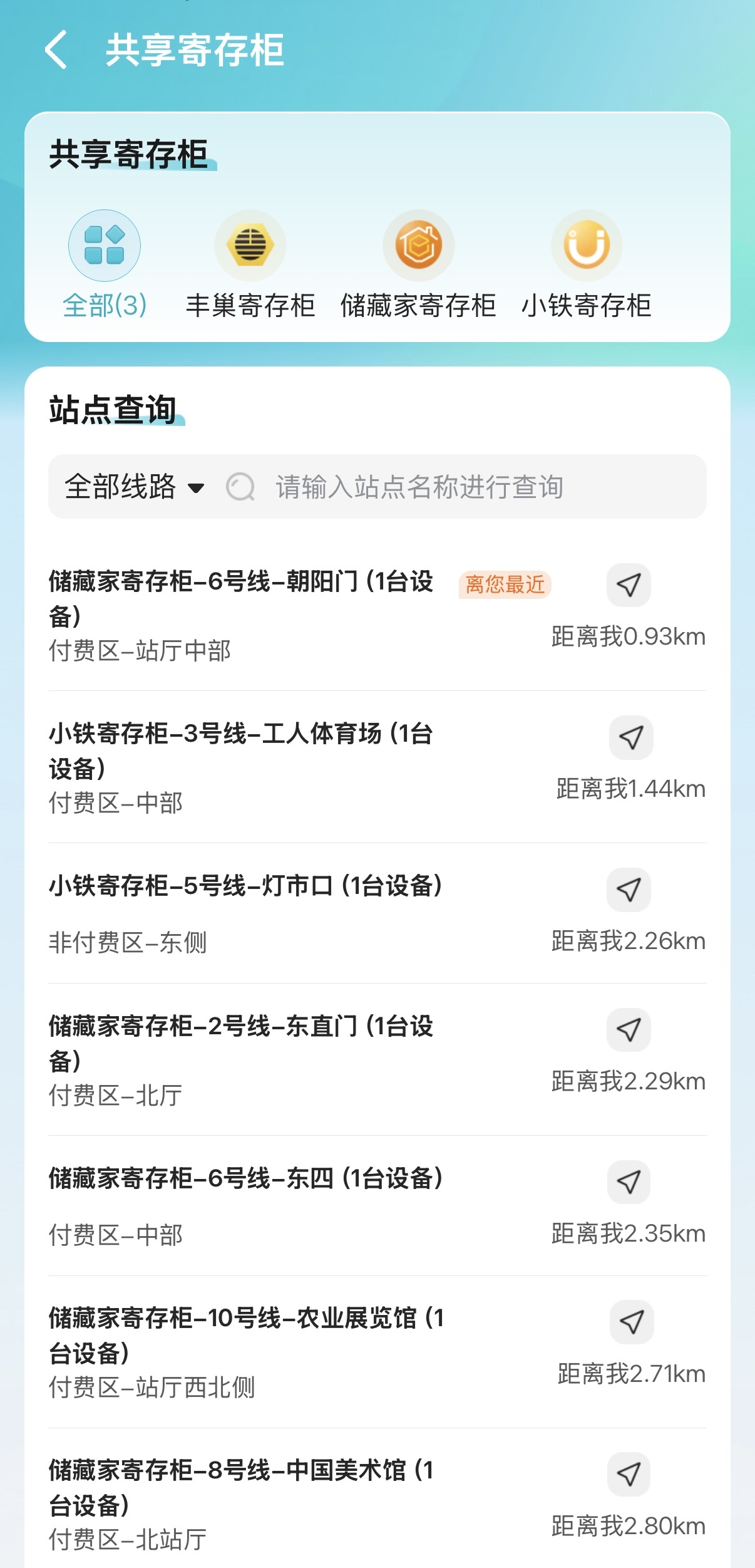 升级后的北京地铁App,在首页及乘车页显著位置增设“便民服务”功能与“地铁便民”模块。乘客可以轻松查询到全市各地铁站内便利店、智能售货柜、便民领水点、共享寄存柜、充电设施等各类便民设施的具置,按需查找服务更便捷。