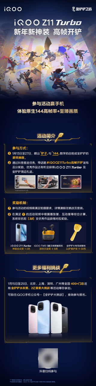 同日,iQOO手机还与游戏《金铲铲之战》开展官方联动,在抖音平台推出「新年新神装 – 高帧开铲」活动,用户在活动期限内完成合拍挑战任务即可参与抽奖;同时iQOO分布在全国的400多家门店也将举办「金铲铲水友赛」「2亿像素大挑战」等线下活动,等待广大铲友踊跃参与。