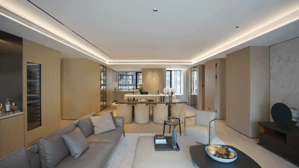 面宽7米的客厅是家庭交流的共享场域,将近70㎡尺度比肩市区顶豪300左右的户型。