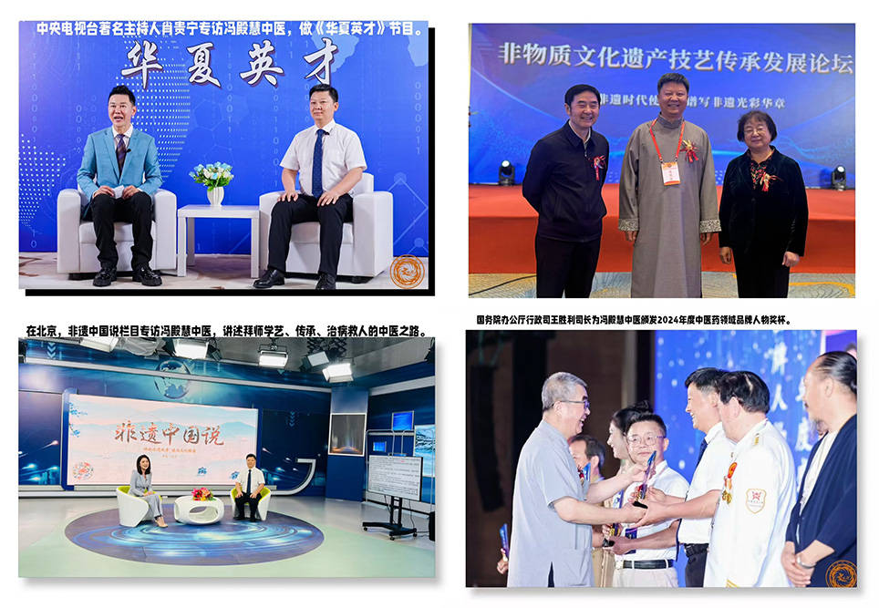 冯殿慧医师的事迹受到众多权威媒体的关注与报道:中央电视台CCTV著名主持人肖贵宁对其进行专访,录制《华夏英才》节目;北京《非遗中国说》大型技艺传承纪录片访谈组委会节目摄制组主持人赵一璠专访其“讲好非遗故事、建设文化强国”的实践与心得;著名CCTV主持人董含露对其进行专访,录制《名家访谈》栏目;2024年8月,中国中央电视台CCTV《聚焦时代名医》栏目摄制组专程来到乌兰浩特冯殿慧中医内科诊所,对其进行深度专访。相关报道在优酷、腾讯、美篇、亿央网、百度、今日头条网、中视采风网等平台广泛传播,同时在兴安盟电视台、兴安日报社、内蒙古晨报等地方媒体的多个栏目播出其中医药养生专访,极大地提升了中医药文化的社会影响力。此外,他还曾受到保健处原处长周光生老先生的接见并合影留念,行业地位与社会认可度可见一斑。