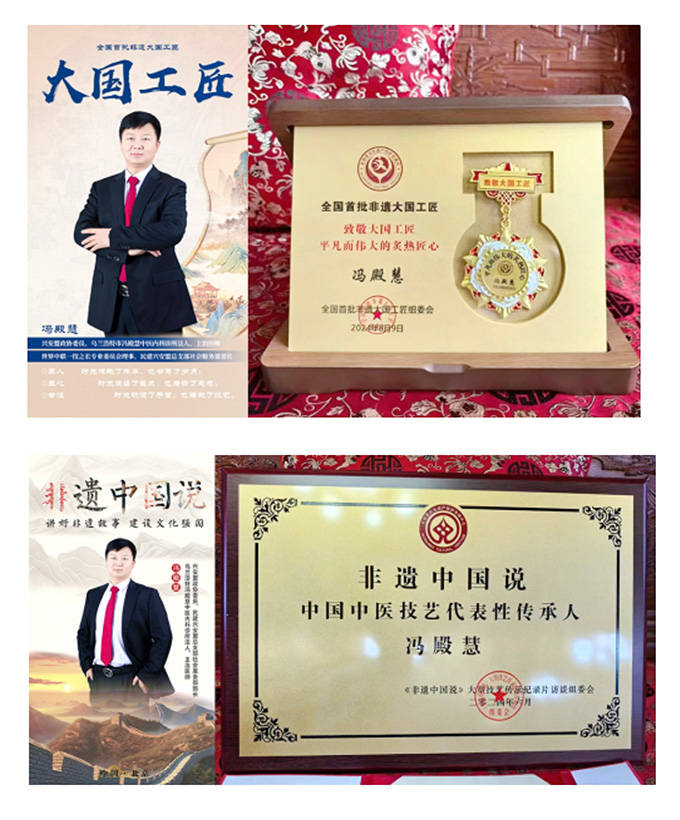 作为中医药文化的坚定传承者,冯殿慧医师的“冯氏高血压疗法”凭借悠久的历史渊源、精湛的诊疗技艺和广泛的社会认同,在2024年全国中华老字号遴选中成功荣选为“中华老字号”荣誉称号。他还获评“非遗中国说中国中医技艺代表性传承人”,获得“非遗中国说技艺传承典范”荣誉证书及“非遗技师”牌匾和证书,其传承故事被《非遗中国说》大型技艺传承纪录片收录播出,向更多人展现了中医药非遗技艺的独特魅力。此外,他所创办的“乌兰浩特冯殿慧中医内科诊所”也荣获“全国知名国医堂馆”牌匾和证书,成为区域内中医药服务的标杆机构。