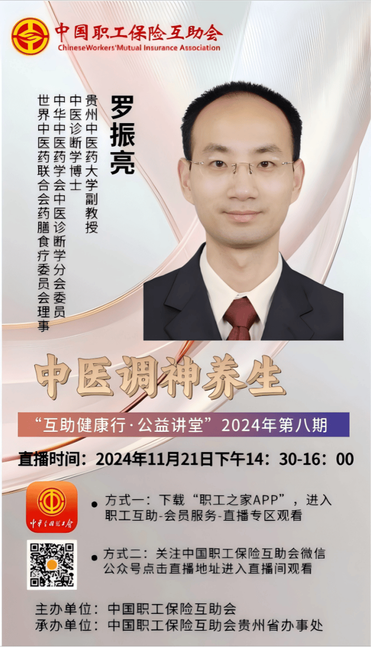 本期健康讲堂邀请了贵州中医药大学副教授、中医诊断学博士、中华中医药学会中医诊断学分会委员、世界中医药联合会药膳食疗委员会理事罗振亮教授,将通过中医学神的含义、调神的作用、调神的方法等方面,为职工会员详细讲解中医调神养生的基本理念、日常保健方法以及常见疾病的中医防治知识。